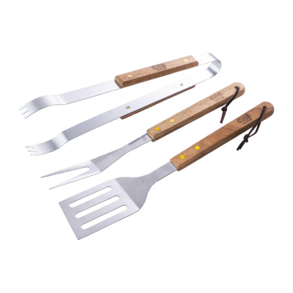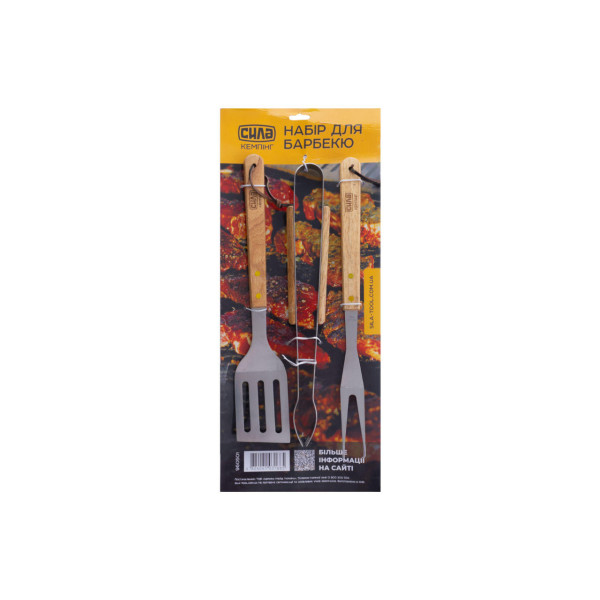 Набір для гриля Сила складається з 3 предметів: лопатки, виделки та щипців довжиною 380 мм. Призначений для приготування та подачі страв під час використання мангала або гриля.