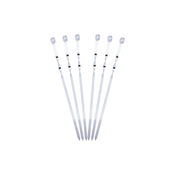 Набір шампурів Скаут складається з 6 штук довжиною 445 мм. Призначений для приготування продуктів на мангалі або грилі. Підходить для нанизування м’яса, риби, овочів та інших інгредієнтів.